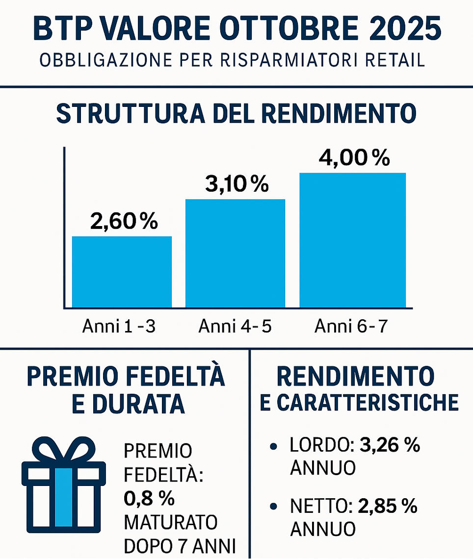 Da lunedì 20 ottobre e fino alle ore 13.00 di venerdì 24 ottobre 2025 (salvo chiusura anticipata), parte la nuova emissione del BTP Valore, il Titolo di Stato pensato esclusivamente per i risparmiatori individuali e affini (i cosiddetti retail). Il titolo avrà una durata di 7 anni e prevede cedole trimestrali che aumentano progressivamente nel tempo, grazie a un meccanismo detto “step-up”. Ma cosa significa esattamente? Con questo meccanismo le cedole riconosciute agli investitori crescono in base a una precisa suddivisione temporale: in questo caso nei primi 3 anni la cedola sarà di un certo importo, nei successivi 2 anni aumenterà, e salirà ulteriormente negli ultimi 2 anni (da cui la formula “3+2+2 anni”). A ciò si aggiunge un premio finale extra dello 0,8% per chi mantiene il titolo fino alla scadenza. Quali sono nel dettaglio le sue caratteristiche? Conviene davvero sottoscrivere questo BTP?