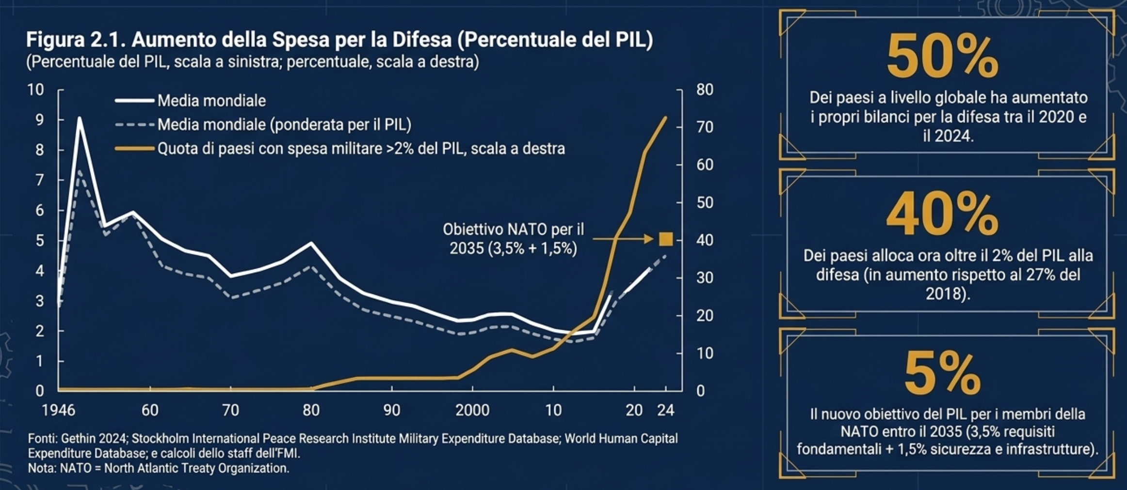 Quando ho iniziato a studiare economia all’università, ormai oltre 30 anni fa, i manuali più diffusi spiegavano che la principale scelta economica di uno Stato era rappresentata da quanto spendere in burro e quanto in cannoni. I cannoni rappresentano la spesa in armamenti e sicurezza, mentre il burro quella in scuola, sanità, pensioni, assistenza ai più poveri. Questa scelta è diventata sempre meno importante quando sono calate le tensioni internazionali e la maggior parte degli stati sviluppati ha preferito la pace ed il libero commercio internazionale alle guerre, riducendo drasticamente la spesa militare. Ma il panorama globale sta nuovamente e rapidamente cambiando negli ultimi anni: dopo decenni di relativa calma dopo la Guerra Fredda, il numero di conflitti attivi è salito a livelli mai visti dalla fine della Seconda guerra mondiale. Le crescenti tensioni geopolitiche e le maggiori preoccupazioni per la sicurezza stanno spingendo molti governi a rivalutare le loro priorità e spendere di più per la difesa. Queste spese fanno bene o male alla crescita economica? Uno studio del Fondo Monetario Internazionale pubblicato in settimana cerca di rispondere a questo interrogativo.