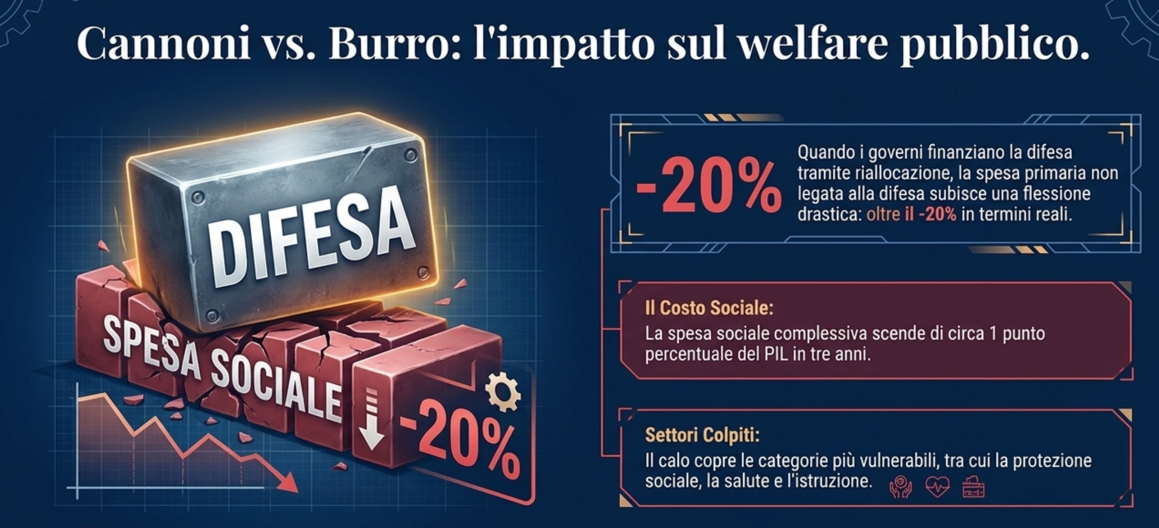 Il cuore del problema è il trade-off tra “cannoni e burro”. Quando un governo decide di non fare debito, ma di finanziare la difesa tagliando altre spese, le conseguenze possono essere pesanti. Il report mostra che in questi casi la spesa sociale (sanità, istruzione, pensioni) crolla drasticamente, con tagli reali che possono superare il 20% in tre anni. La situazione diventa drammatica in tempo di guerra: qui il debito pubblico esplode (crescendo mediamente di 14 punti di PIL) e i servizi per i cittadini vengono sacrificati indipendentemente da come si decide di pagare le armi.