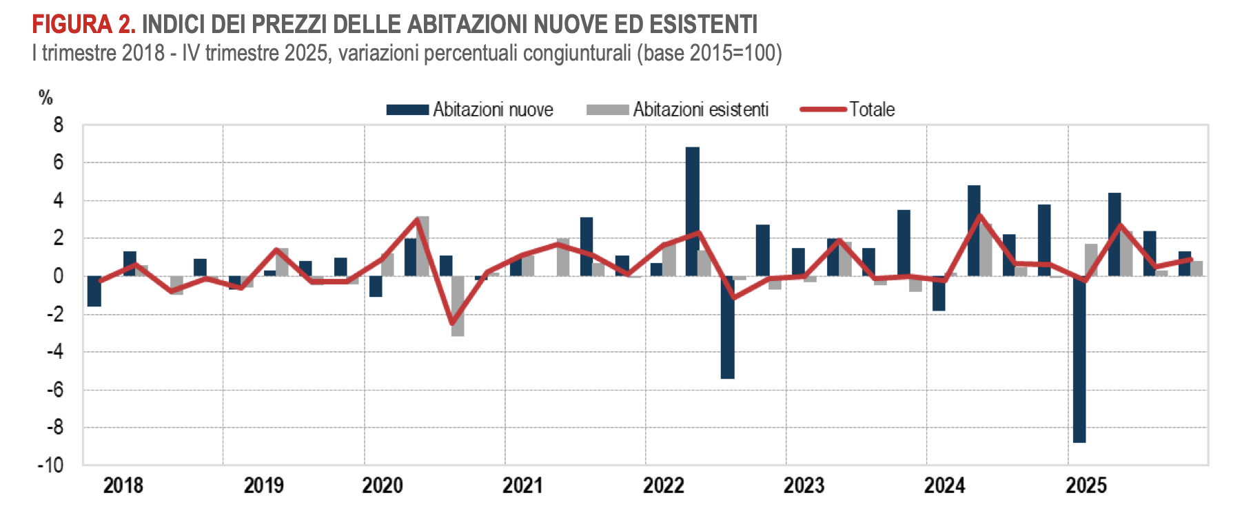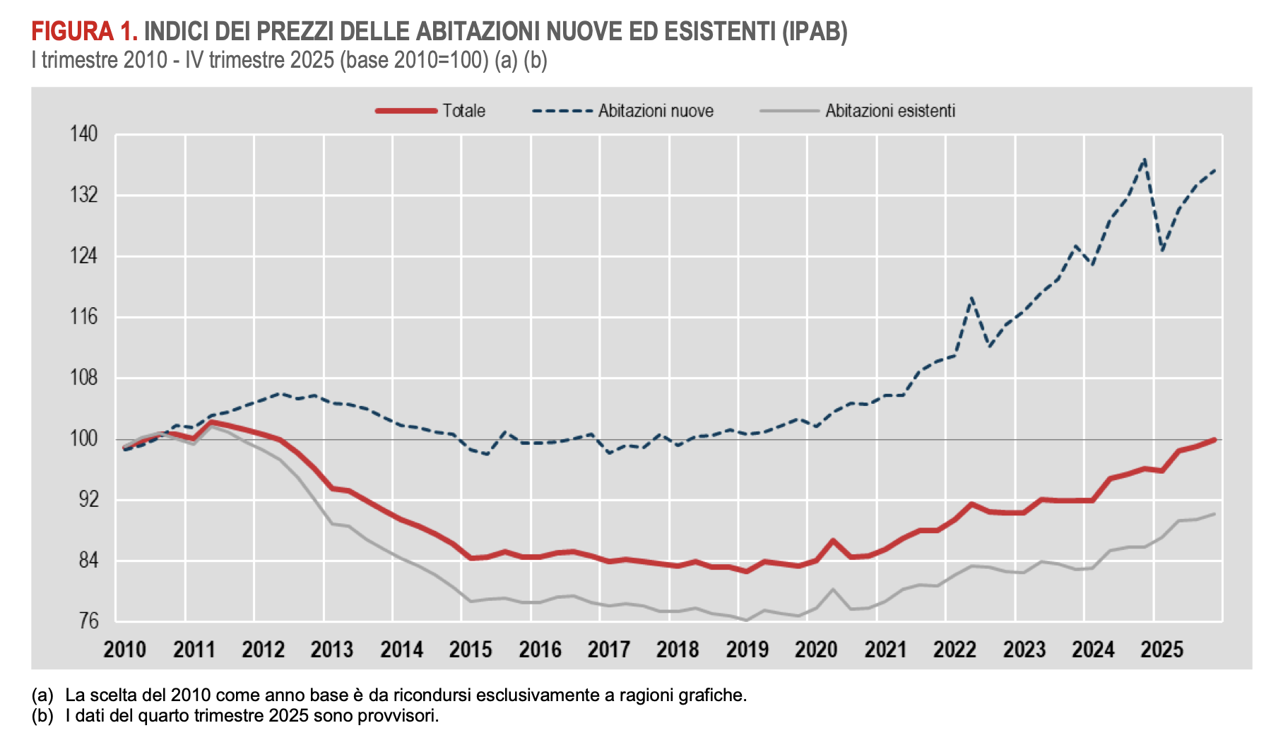 Il report Istat allunga l’orizzonte temporale di analisi con dati che partono dal 2010.  Lo scenario descritto è particolarmente interessante e sembra contraddire molti luoghi comuni sull’andamento dei prezzi degli immobili. Come si può osservare dalla linea rossa nel grafico sotto, i prezzi medi delle abitazioni sono scesi dal 2010 al 2019 per poi riprendersi negli anni successivi, recuperando solo a fine 2025 i valori di quindici anni prima. I dati raccolti dall’Istat ci mostrano che i prezzi delle abitazioni possono continuare a scendere per anni prima di che la tendenza si inverta e non sempre crescono anche nel lungo periodo.