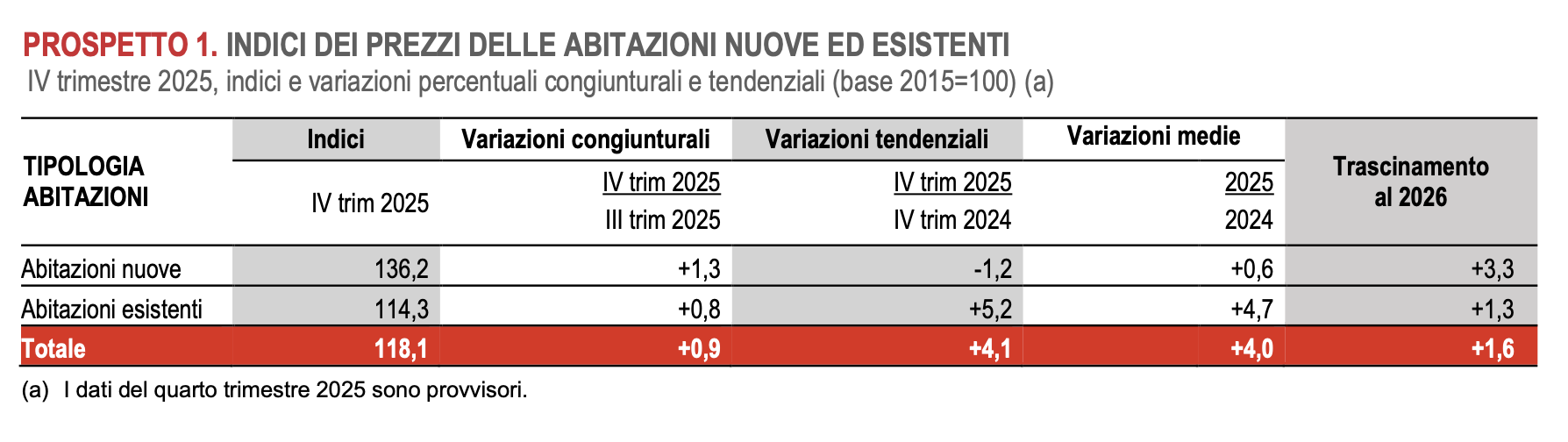 Secondo l’Istat nel quarto trimestre 2025 l’indice dei prezzi delle abitazioni (IPAB) è aumentato dello 0,9% rispetto al trimestre precedente e del 4,1% rispetto allo stesso periodo del 2024. La crescita dei prezzi è da attribuirsi unicamente a quelli delle abitazioni già esistenti che aumentano del 5,2%, mentre i prezzi delle abitazioni nuove registrano una contrazione dell’1,2%, segnando un cambiamento di tendenza rispetto agli anni precedenti. In media, nel 2025 la crescita dei prezzi delle abitazioni risulta sostenuta (+4,0%) e determina un “effetto di trascinamento” per il 2026 dell’1,6%. La tabella qui sotto riporta i dati Istat.
