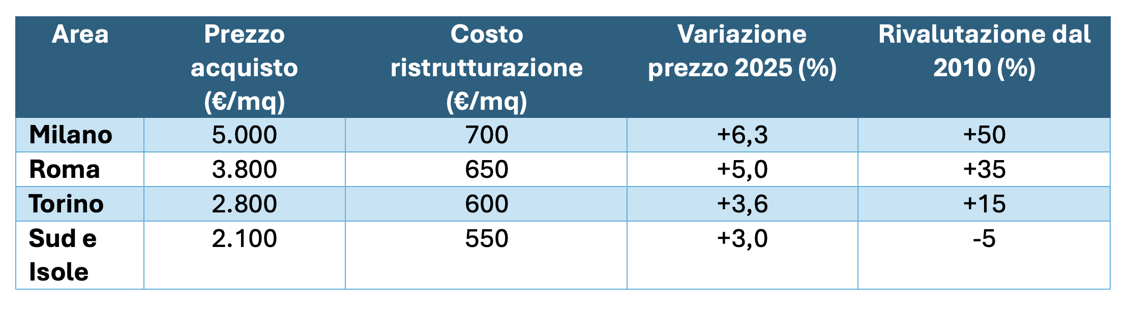È opportuno ricordare che si tratta di una media nazionale, con realtà territoriali che si discostano notevolmente dai valori indicati. Ad esempio, Milano ha visto i prezzi crescere di oltre il 50% dal 2010, mentre sud e isole hanno sperimentato un andamento meno favorevole con un livello medio dei prezzi ancora inferiore del 5% rispetto al 2010.