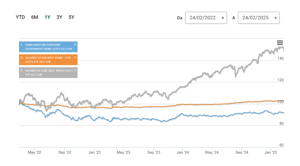 Al contrario, liquidare completamente la propria esposizione azionaria a vantaggio delle obbligazioni o della liquidità potrebbe non rivelarsi una strategia vincente. Sebbene il passato non necessariamente si ripeta uguale a sé stesso, può essere utile verificare cosa è successo nei tre anni successivi all’inizio della guerra in Ucraina nel febbraio 2022. Si tratta di uno scenario simile anche se non identico in cui vi è stata una esplosione dei prezzi energetici in un quadro di crisi geo-politica per lo scoppio di una guerra. Il grafico sotto, che riporta l’andamento di 3 ETF che replicano l’andamento dei titoli di stato dell’area euro a breve termine, dei titoli di stato a lungo termine e dei mercati azionari internazionali, evidenzia questi risultati a tre anni dall’inizio del conflitto: